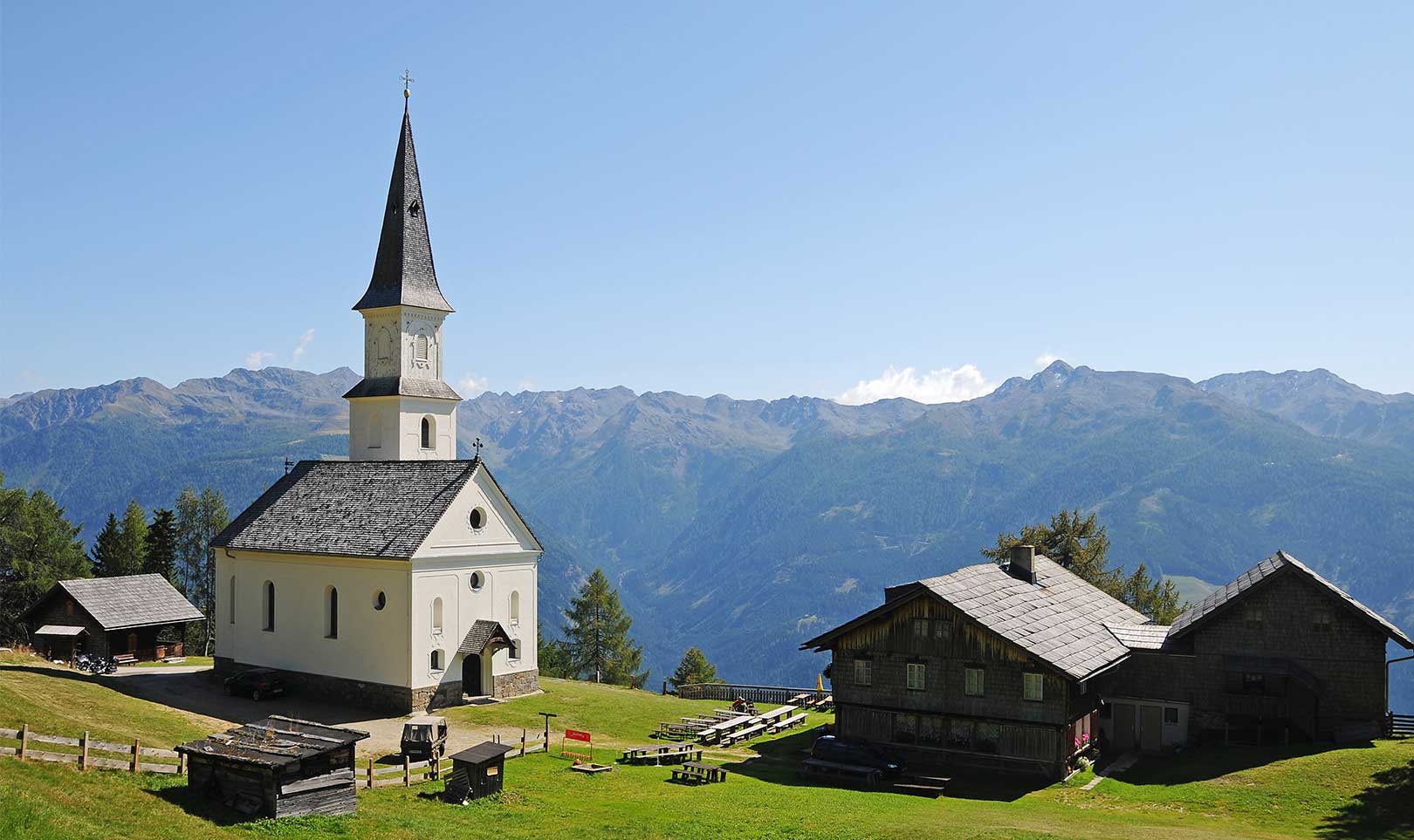 Hier wartet ein prächtiger Ausblick auf die Kreuzeckgruppe und die Lienzer Dolomiten. Zudem ist sie ein beliebter Ausgangspunkt für verschiedene Wanderwege. So startet hier beispielsweise die vierte Etappe des Weitwanderweges Alpe-Adria-Trail, leicht erkennbar an den drei auffälligen Informations-Säulen.